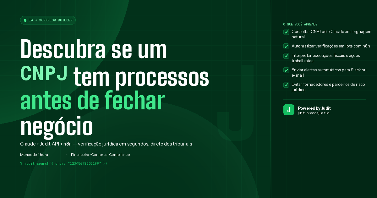 Uma verificação que leva apenas 2 segundos, no entanto, pode evitar meses de dor de cabeça. Por isso, veja como consultar a situação jurídica de qualquer CNPJ usando a Judit, seja conversando com o Claude, seja por meio de uma automação no n8n.