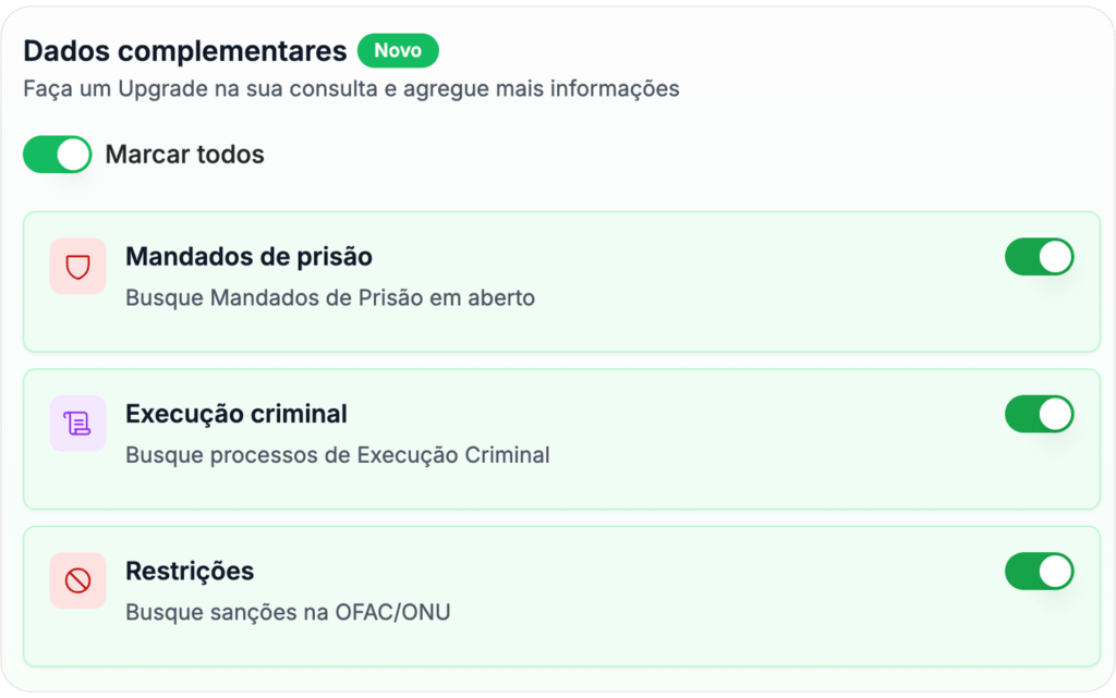 - Listas Restritivas – verifique sanções e restrições internacionais para garantir conformidade regulatória.